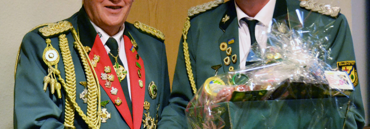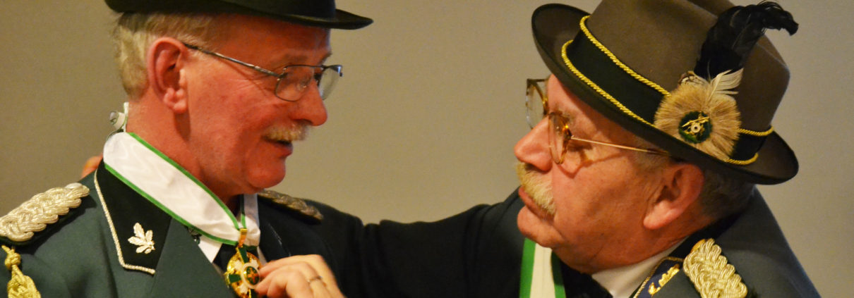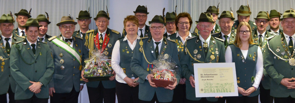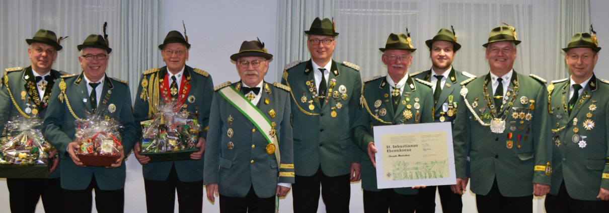 Neben Beförderungen und Ehrungen einiger Schützenmitglieder, konnte der Brudermeister Heil den General Aloys Feldhaus zum 40-Jährigen Vorstandsjubiläum gratulieren. Womit Andreas Heil jedoch nicht gerechnet hat, war seine eigene Ehrung. Der Bezirksbundesmeister Hubert Kessing verlieh ihm den Hohen Bruderschaftsorden aufgrund seiner Verdienste um den Verein und das Schützenwesen. Zurvor konnte Josef Marischen als 2. Vorsitzende ebenfalls vom Bezirksbundesmeister geehrt werden. Sichtlich gerührt nahm Marischen die hohe Auszeichnung des St. Sebastianus Ehrenkreuz an.