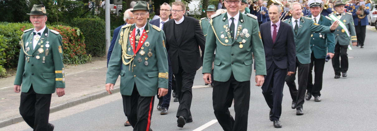 Nach dem Einkleiden am Nachmittag von neun neuen Schützen-Anwärterinnen und -Anwärtern, formierten sich am Abend des Montags die Schützen und das Blasorchester dann noch einmal, um seinen Schützenkönig Rainer Emke abzuholen und noch bis spät in den Abend das Schützenfest ausklingen zu lassen.
