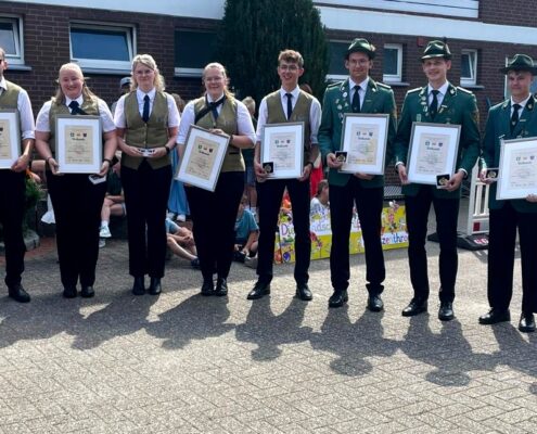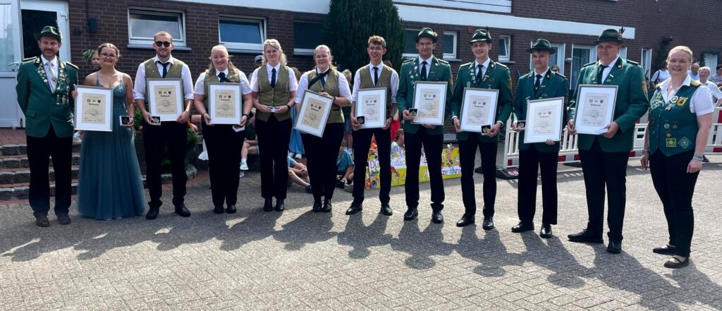 Diözesanjungschützenmeister Tim Winking zeichnete zahlreiche Jungschützen aus, die während der vergangenen Diözesanjungschützentage im Mai 2025 in Ellenstedt ehrenamtlich engagiert waren und zu einem unvergesslichen Fest von und für die Jugend beigetragen hatten. „Dank Euch waren die Diözesanjungschützentage nicht nur ein Event, sondern für alle Teilnehmer ein unvergessliches Erlebnis!“ Die Ehrung erfolgt vor allen am Schützenplatz vor dem Sportcenter Ellenstedt angetretenen Schützen.