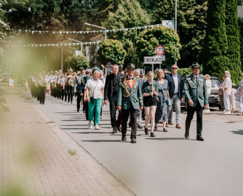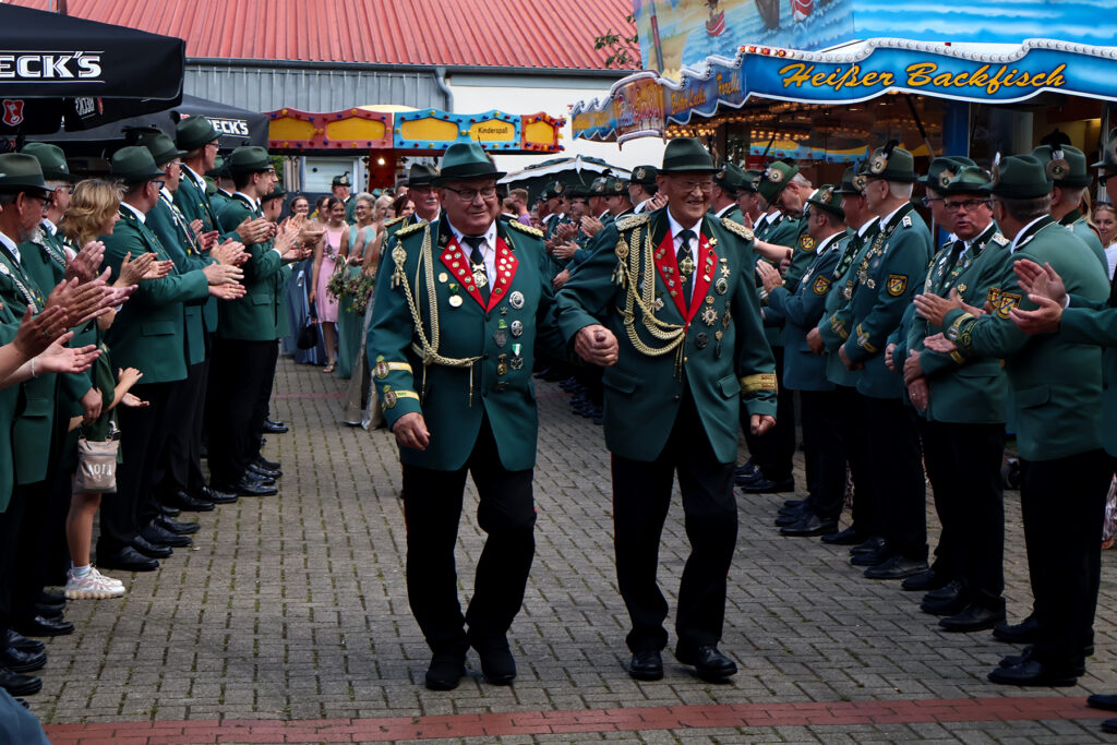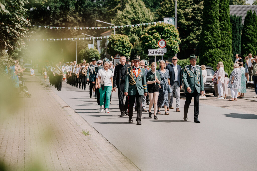 Zum Festumzug am Sonntag waren in diesem Jahr deutlich mehr Teilnehmer als sonst. Neben den Tellverbandsvereinen Hagstedt-Halter, Norddöllen-Astrup, Schneiderkrug-Bühren und Holtrup-Langförden, nahmen Abordnungen der Bruderschaften und Vereine aus Arkeburg, Lutten, der Kompanie Nordwasser des BSV Vechta, Rechterfeld und des Schützenvereins Rüssen, sowie erstmalig seit 25 Jahren auch eine Abordnung des Schützenvereins Visbek an der Zeremonie teil.