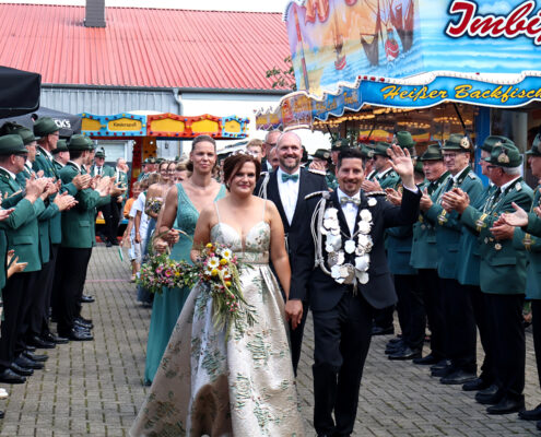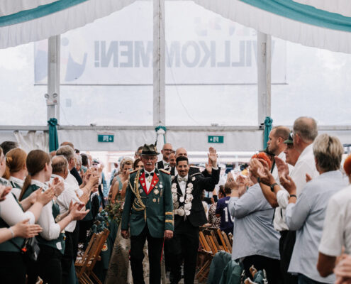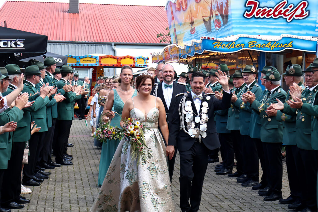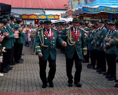 Der Nachmittag wurde entweder an der Hermanns Café & Bar am Sportcenter, beim Einkleiden der Neuschützen oder einfach nur zum Verschnaufen genutzt. Denn bereits um 18 Uhr wurde der König von den Schützen in Begleitung des Blasorchesters Ellenstedt abgeholt. Nach kurzer Stärkung im Garten des Königs bei musikalischer Begleitung wurde zum Festplatz marschiert und bis nach Mitternacht weiter gefeiert. Ehrentänze für Königspaar und Brudermeister Dennis Degenhardt zu dessen 50. Geburtstag rundeten ein vollends gelungenes Jubiläumsschützenfest ab.