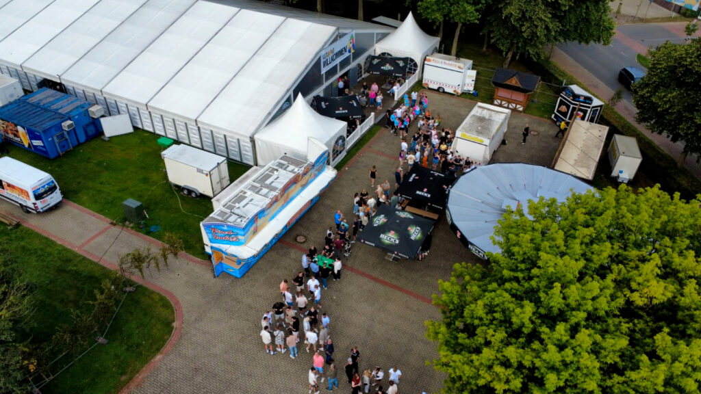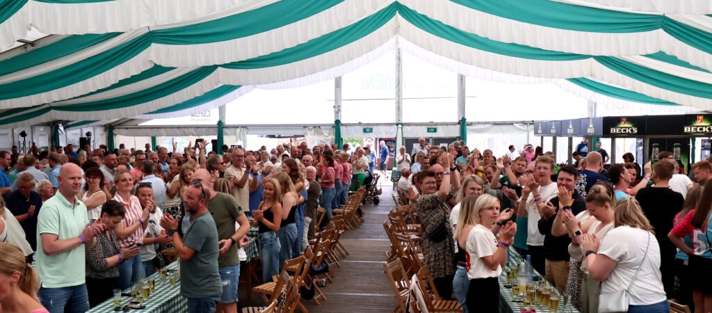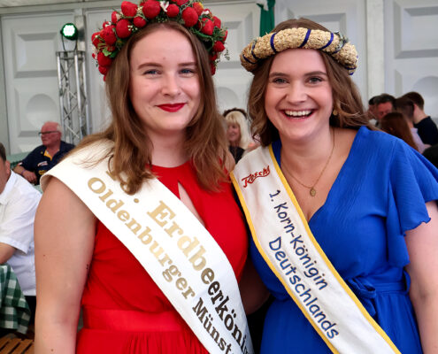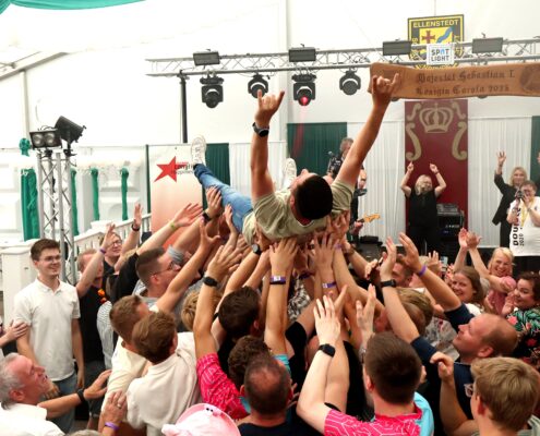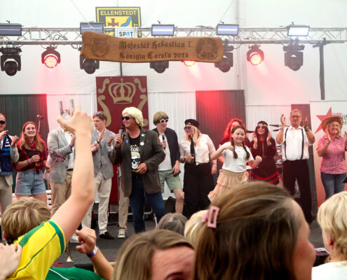 Nach kurzer Nacht stand am Montagmorgen in Ellenstedt der FRÜHSCHOPPEN an, welcher wie gewohnt wieder eine lange Schlange mit Partybegeisterten vor dem Zelt erzeugte. Um 9:20 Uhr waren nahezu alle Plätze im Zelt besetzt und die Party konnte starten. Bei Empfang des Königsthrons standen bereits alle Leute auf den Tischen und Stühlen. Mit dabei auch die 18. Erdbeerkönigin Vanessa I., sowie die 1. Korn-Königin Deutschlands Jana I.